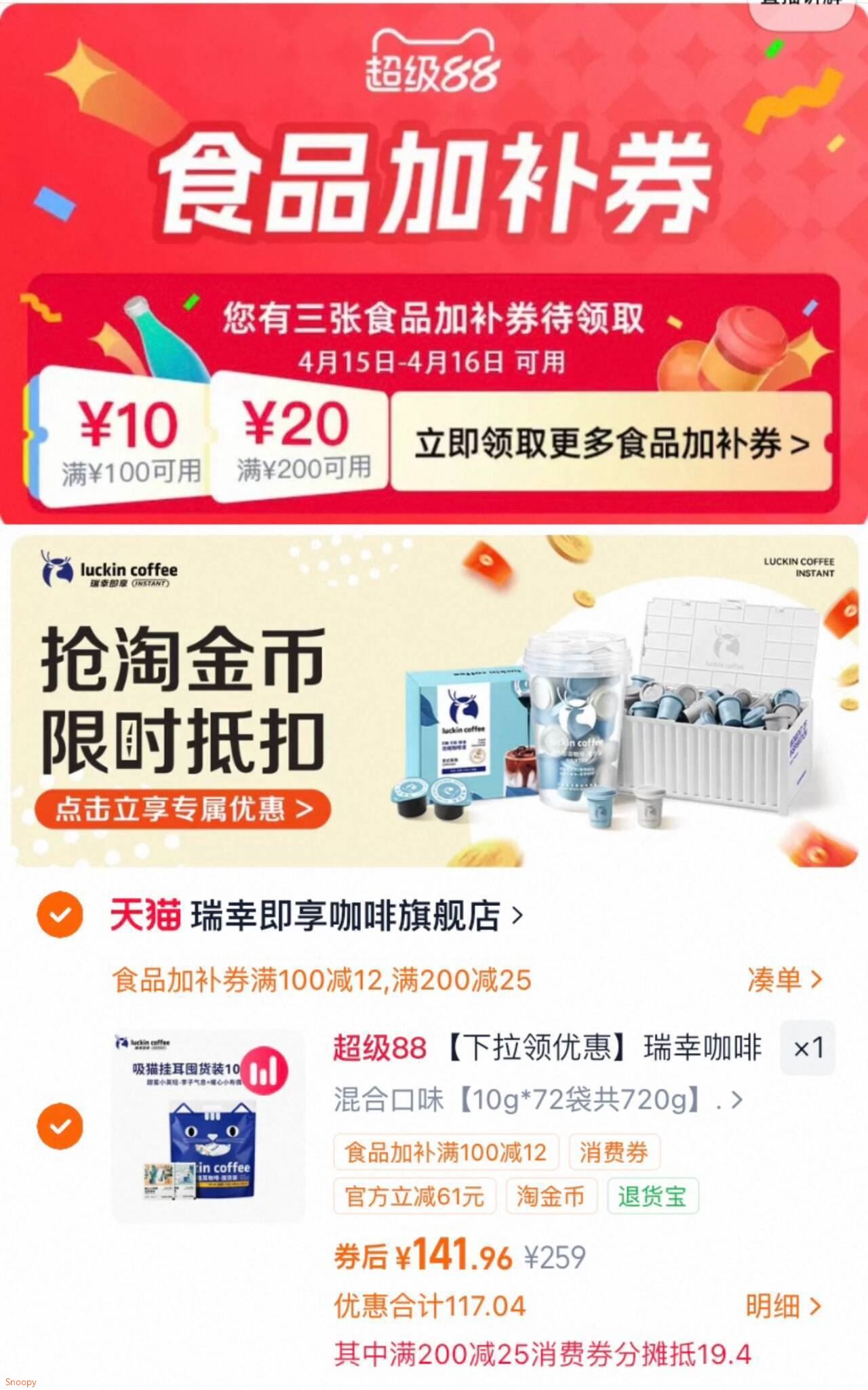 瑞幸挂耳现磨咖啡72袋 141元发报员Z2026年04月17日 15:100举报 141元瑞幸挂耳现磨咖啡72袋折1.9/杯 贈保温杯等10选11入绘領3卷2再下拉叠琻币加车1件3叠100-12美食加布卷4叠88vlp200-25消废奍https://m.tb.cn/h.ipDdEKl复制文案