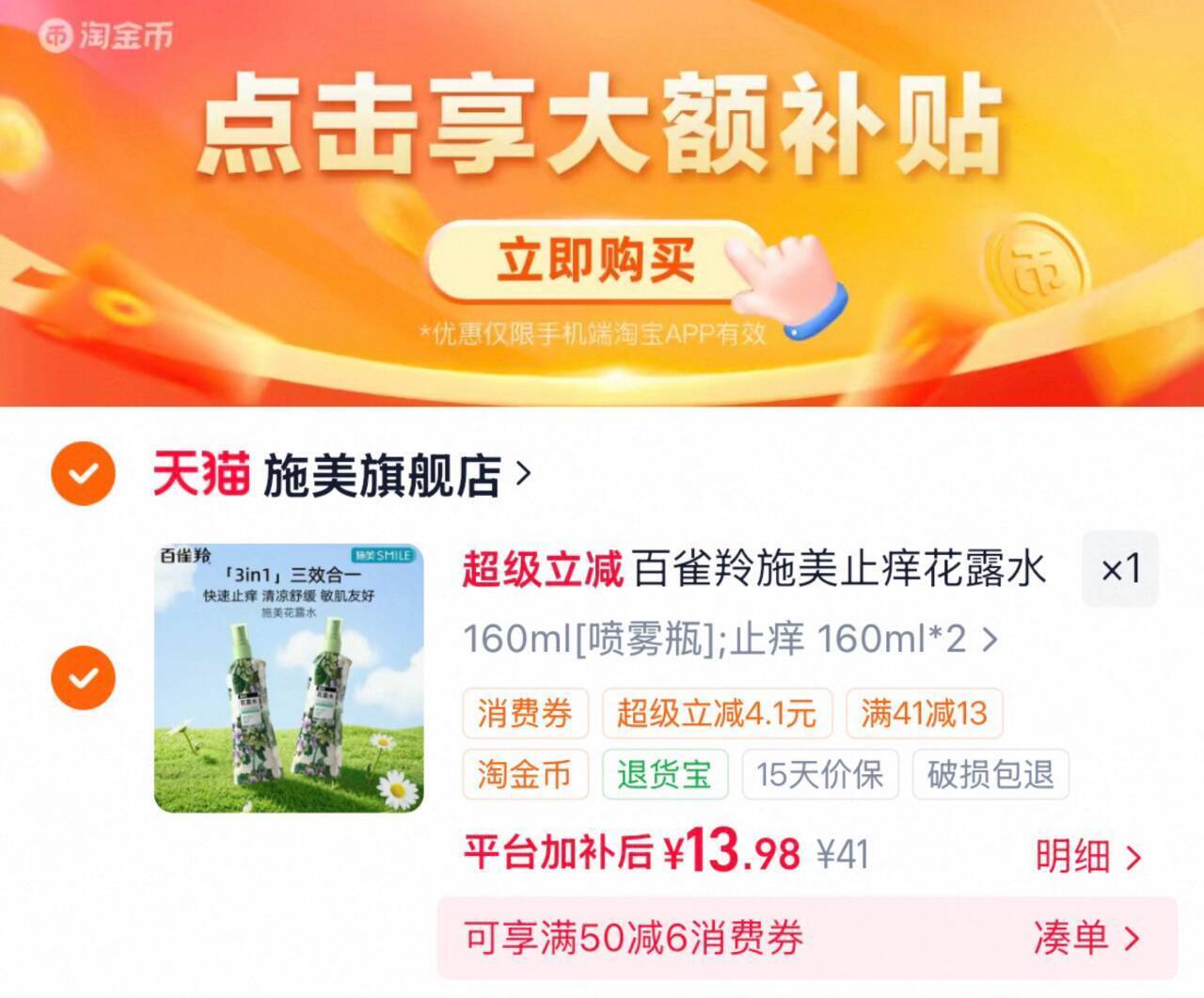 百雀羚止痒花露水喷雾160ml*2瓶 13.9元发报员Z2026年04月17日 17:490举报 百雀羚止痒花露水喷雾 160ml*2瓶 下拉13.9元三效合一太能打 驱蚊 止痒 清凉天然植物萃取配方温和又安全 https://m.tb.cn/h.iqgXQEZ复制文案