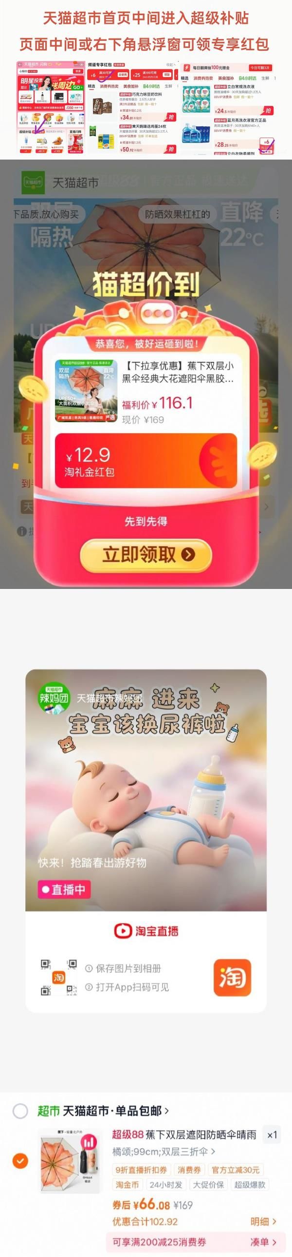 ①右上角进入超市直播间或扫图二进入辣妈团直播间,领9折主播券,加购商品