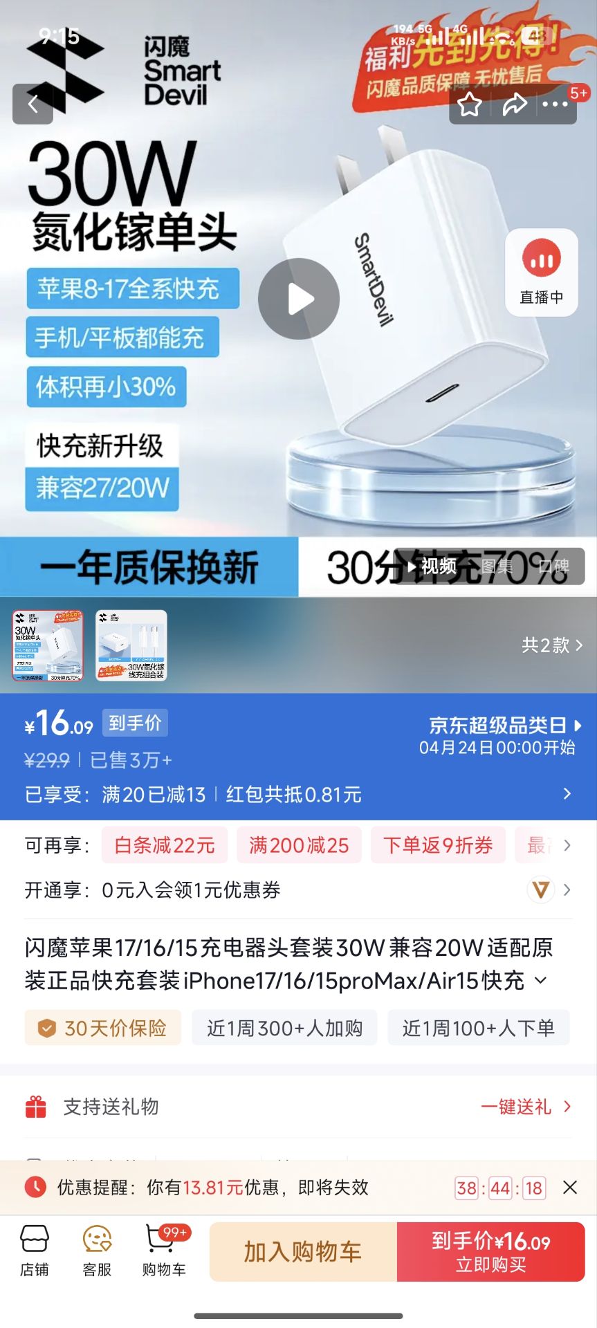 闪魔PD30W氮化镓充电 16.9元发报员Z2026年04月20日 10:400举报 闪魔PD30W氮化镓充电【16.9】https://u.jd.com/jgU9zaC领https://u.jd.com/j6UkO4U复制文案