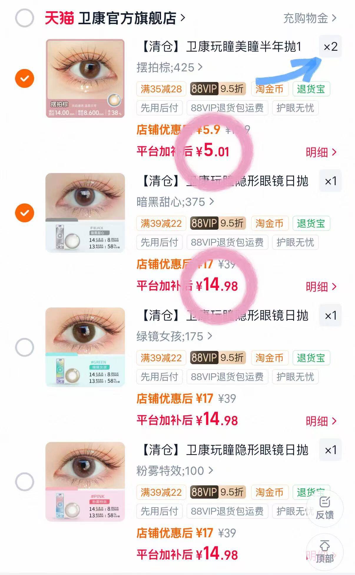 卫康半年抛美瞳任选2片 10元
