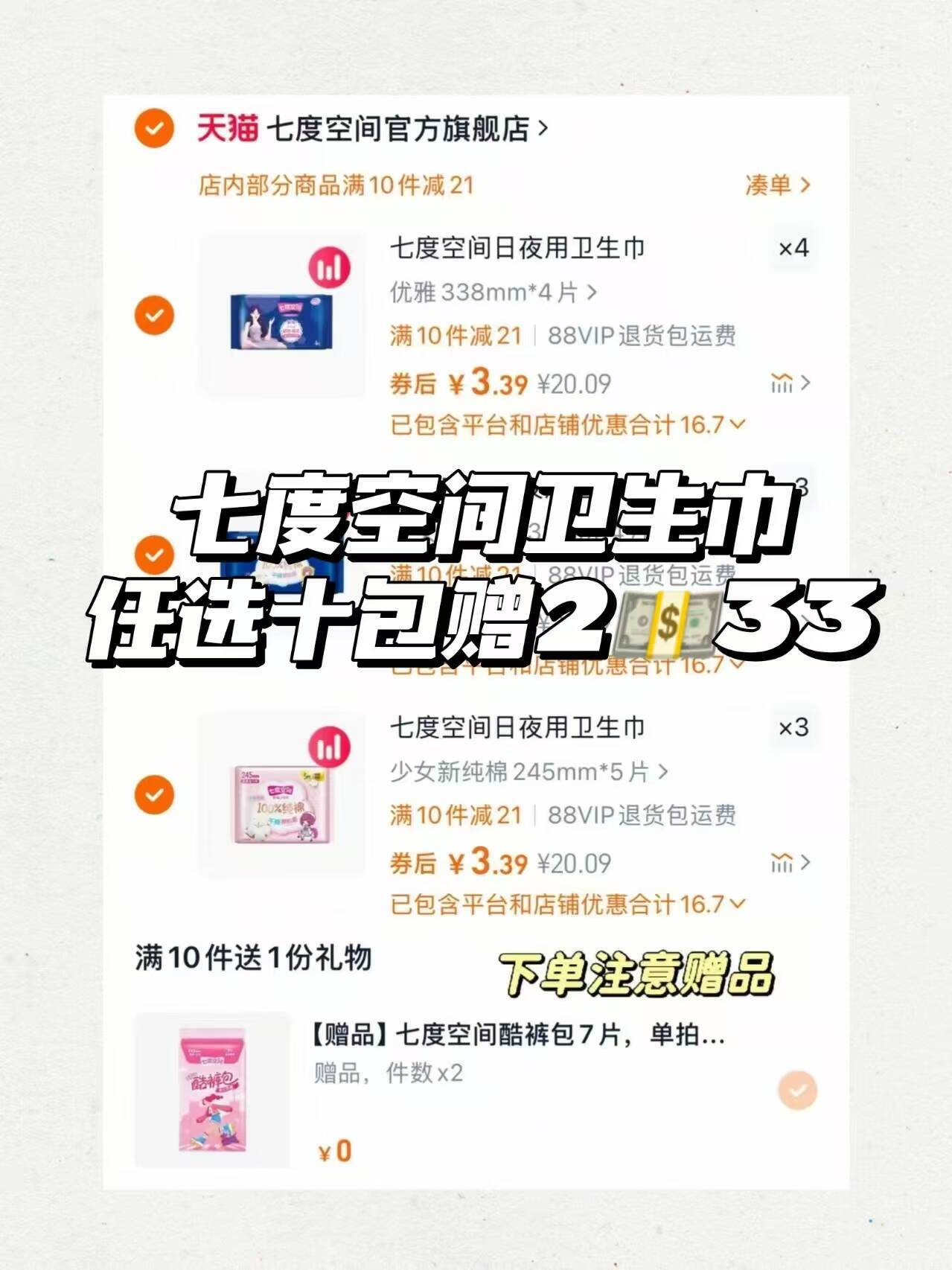 七度空间卫生巾任选10件赠2包日用 2.7元/包