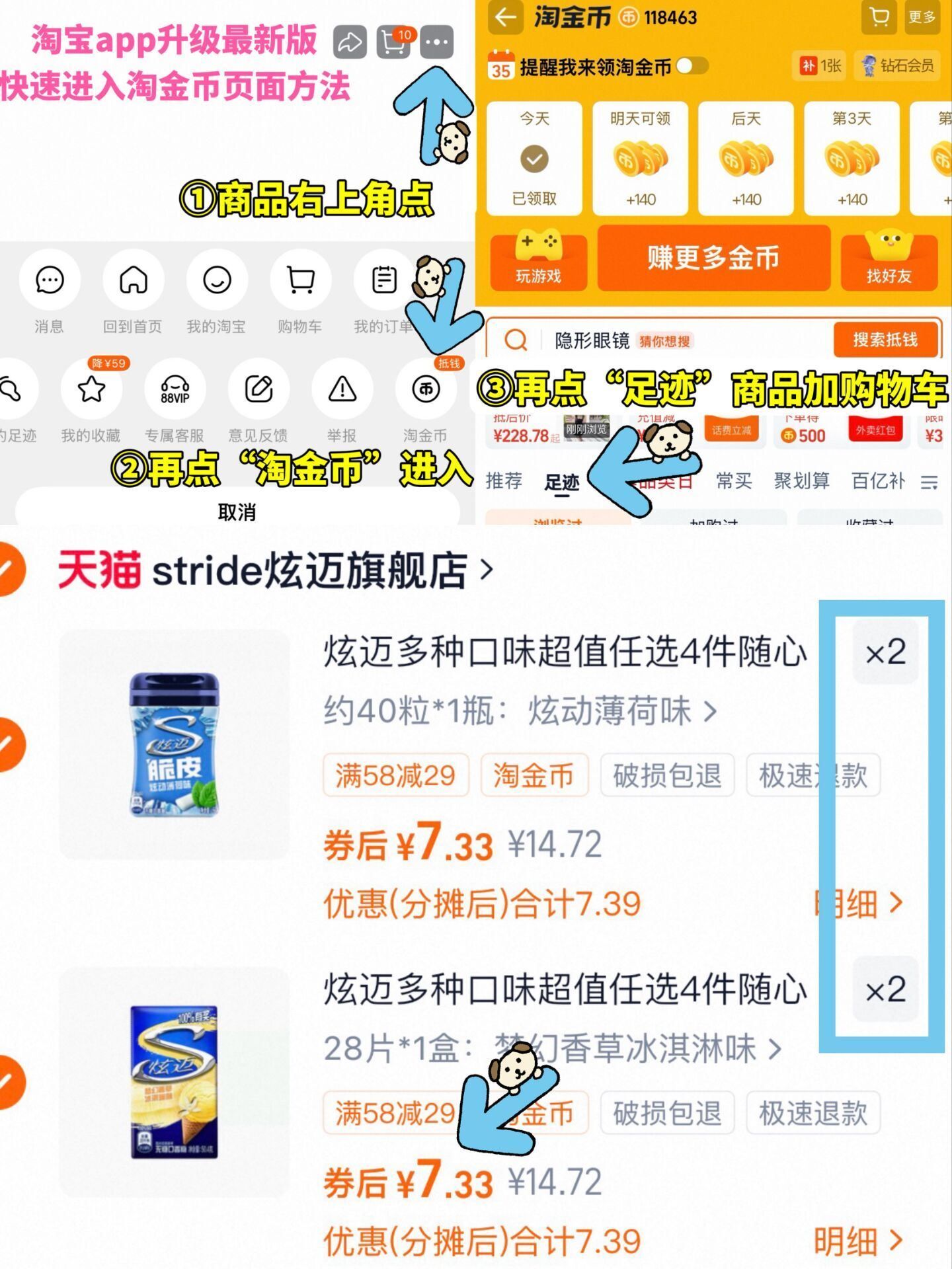 ①如图点右上角3个点选淘金币