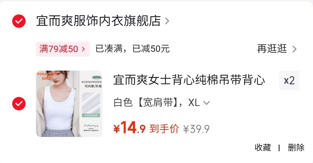 宜而爽 女士背心纯棉吊带背心,任选2件【29】