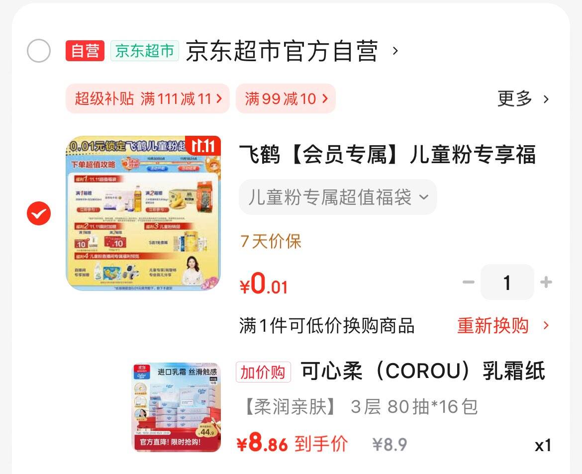 飞鹤0.01 加入购物车可换购 8.9元 可心柔如霜纸 3层S码80抽*16包 (商品下架不用管