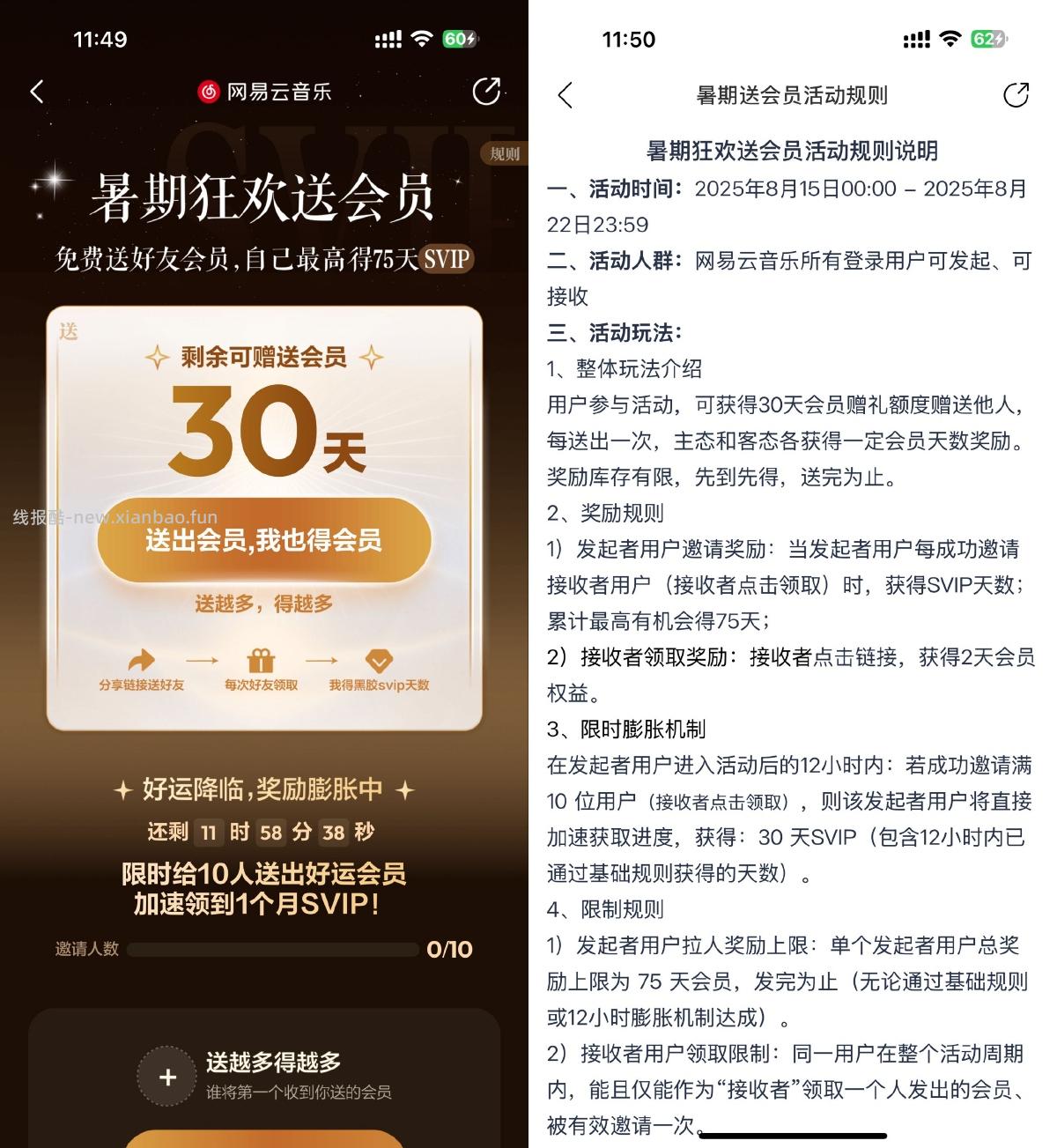 网易云音乐免费互送黑胶会员 小刀 2025年09月20日 11:52 0 举报 跳转到网易云音乐APP->可免费送15个2天会员,同时自己也会获得最高75天会员->累计送给10个人额外领1个月会员活动地址:https://tb3.cn/Au6Kf9 复制文案 原文地址:https://www.x6d.com/i-wz-29936.html版权声明:本站作为免费线报整合平台,文章快照抓取源于网络。临时存储未经验证,本站不参与任何平台活动,请自行甄别,谨防受骗!