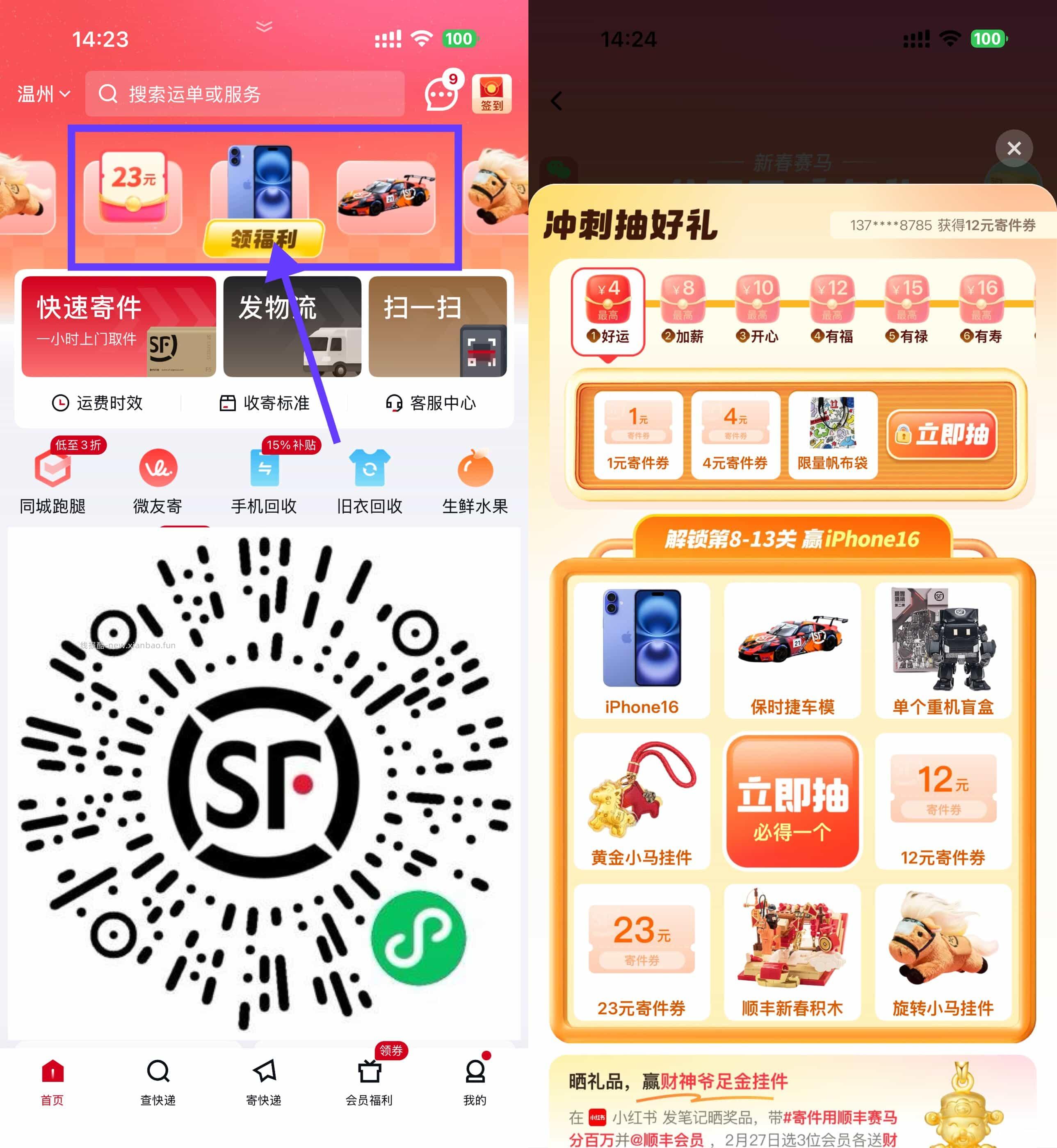 【顺丰新年赛马抽寄件券或实物】顺丰APP或小程序->首页横幅进入->简单浏览得次数,拆礼盒每闯一关抽寄件券或实物