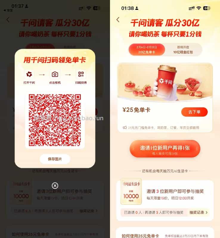 千问领最高21张奶茶免单券小刀2026年02月06日 01:340举报千问APP发送“给我点杯奶茶”->自动领淘宝闪购价值25亓的奶茶免单券,可0.01亓喝奶茶————每邀请1人可得1张奶茶免单券,最多可邀请20人,库存共8千万张免单券!活动地址:点击进入复制文案原文地址:https://www.x6d.com/i-wz-31127.html版权声明:本站作为免费线报整合平台,文章快照抓取源于网络。临时存储未经验证,本站不参与任何平台活动,请自行甄别,谨防受骗!