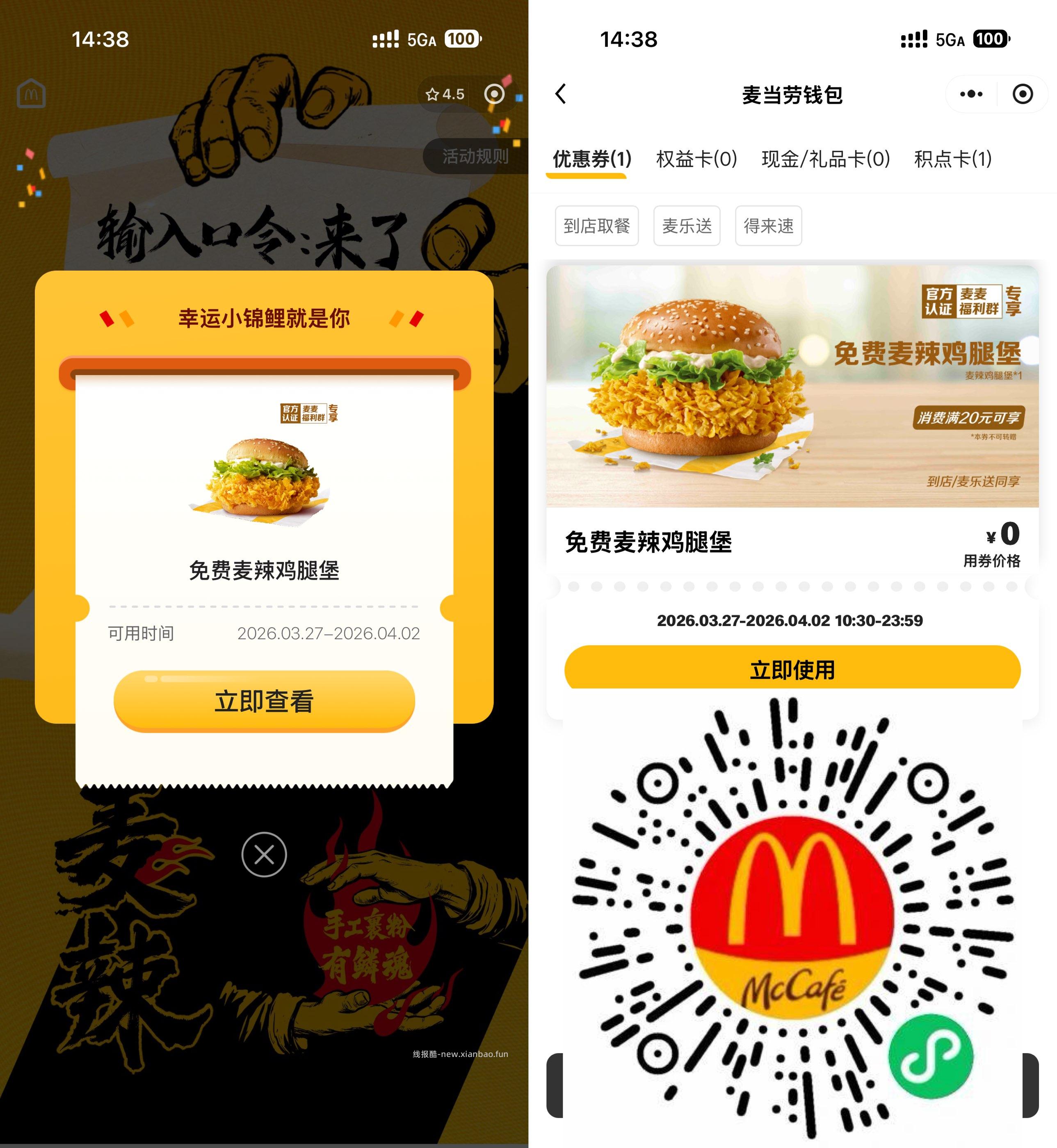 微信打开活动->输入口令“来了”领免费麦辣鸡腿堡,需任意消费20亓随单使用