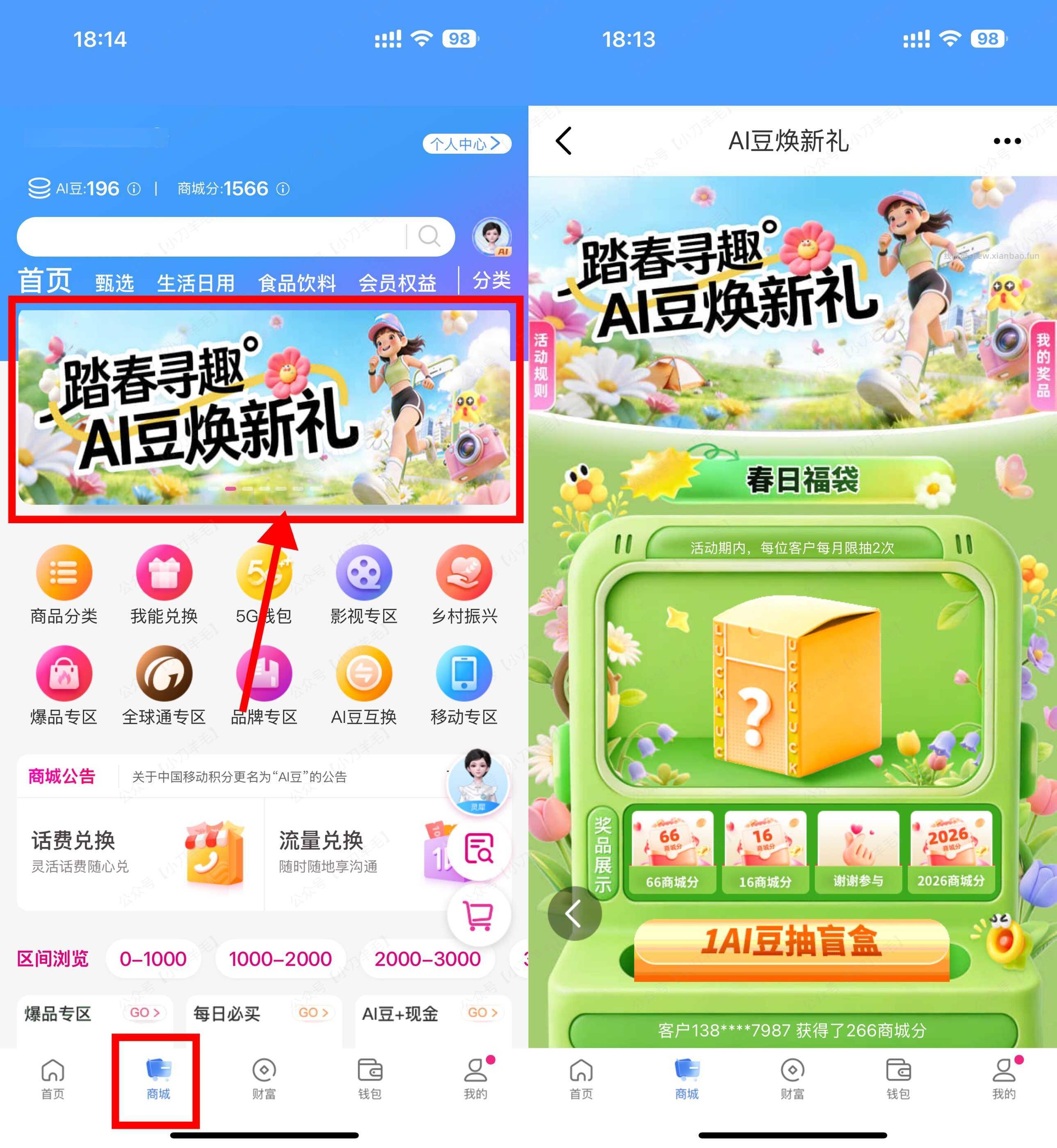 和包APP底部“商城”->横幅“踏春寻趣”->有2次机会抽积分,累计积分可兑换实物等奖励